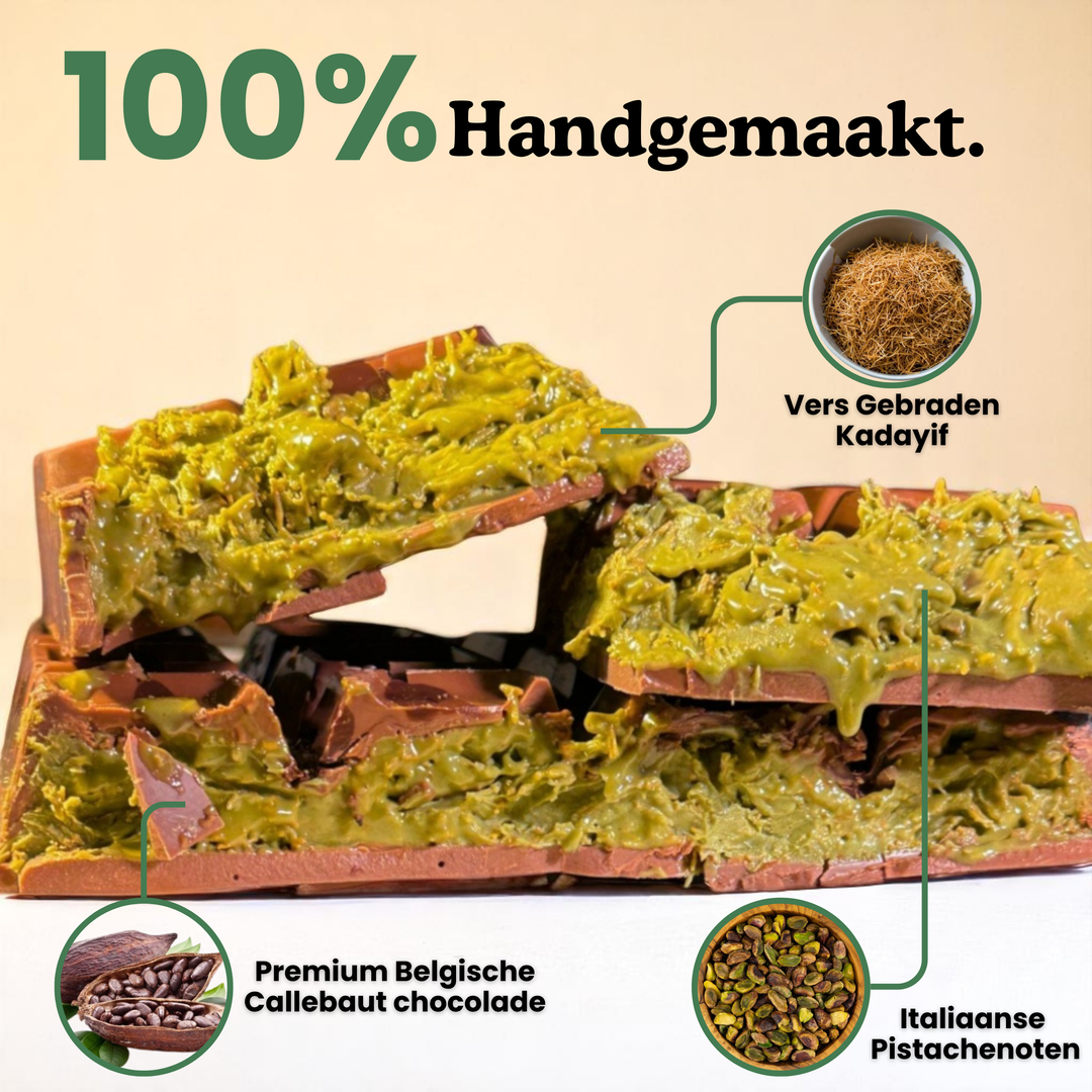 Our approach. While competitors choose the easy way with green food coloring, flavor enhancers, and cheap chocolate, we chose the hard way. No compromises. We use 100% pure pistachio paste (without any additives), freshly roasted knafeh for that extreme crunch, and premium Belgian Callebaut chocolate. When we say "filled," we mean truly filled.